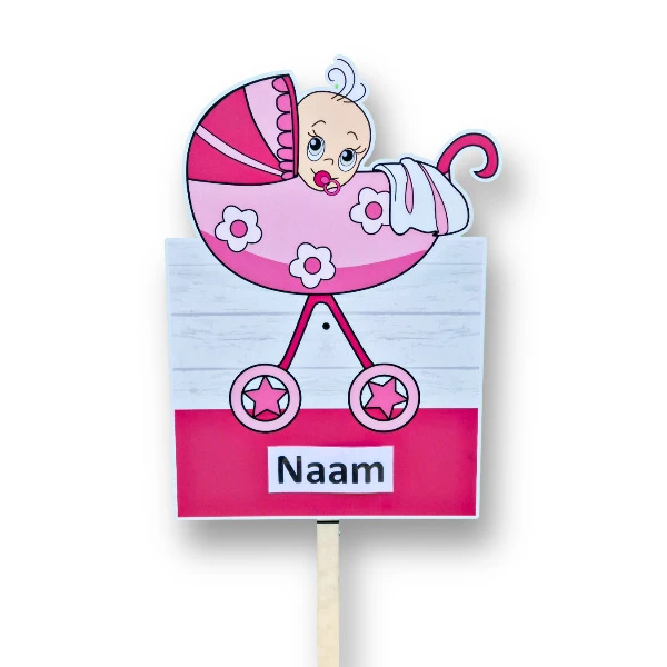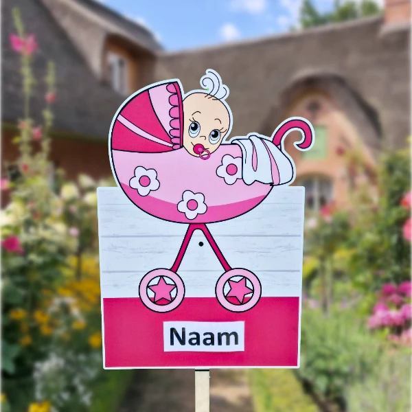 Ons geboortebord met baby in kinderwagen in roze is een van de schattigste en meest populaire ontwerpen. Het bord straalt vrolijkheid en warmte uit, met een schattige baby in een roze kinderwagen die het perfecte symbool is voor de komst van een meisje. De zachte roze tinten en het schattige ontwerp maken dit bord de ideale manier om de geboorte van je dochtertje aan te kondigen. Het naambordje wordt op de juiste plek geplaatst, zodat iedereen weet wie er is geboren!