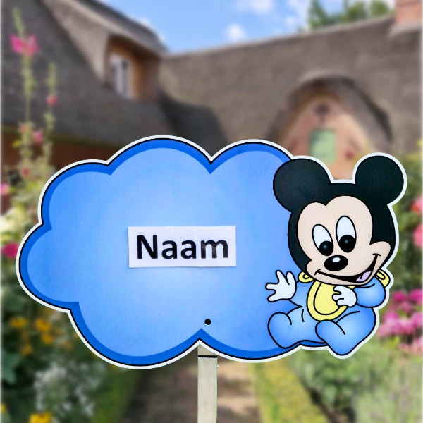 Geboortebord tuin Baby Mickey Mouse op wolkje