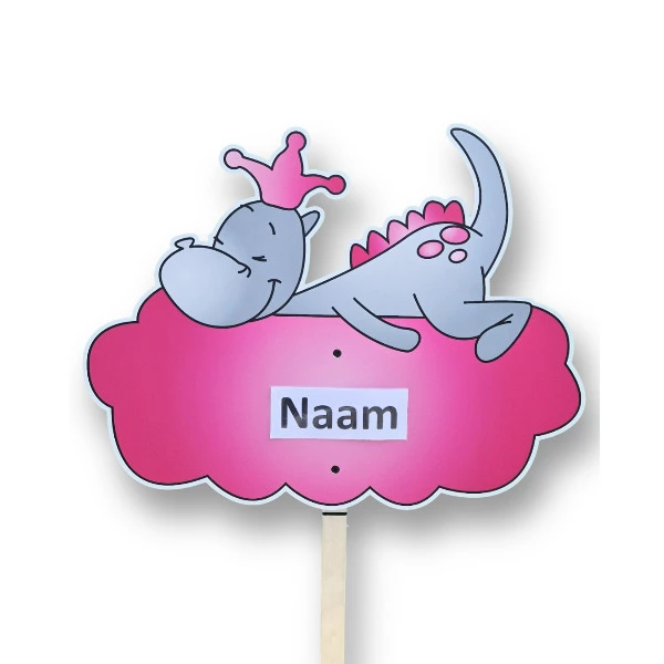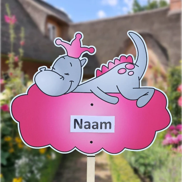 Geboortebord tuin draakje Dirk op roze wolk