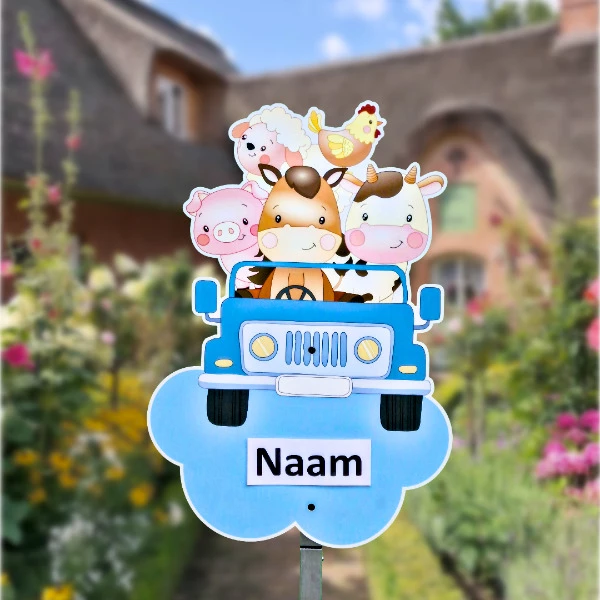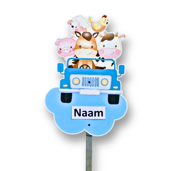 Geboortebord tuin Jeep met boerderijdieren – blauw