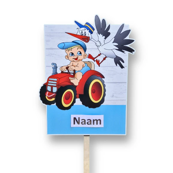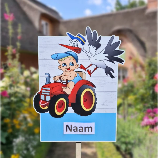 Is er een kleine op komst en wil je dit op een bijzondere manier vieren? Wat dacht je van een geboortebord met een tractor, of trekker zoals sommige mensen het noemen? Hoe je het ook noemt, dit leuke geboortebord met een jongen op de tractor en een ooievaar die achter hem aan vliegt, is een geweldige manier om de komst van een baby aan te kondigen! Dit originele ontwerp valt gegarandeerd op in de tuin en is een eye-catcher voor iedere kraamvisite. Het geboortebord is eenvoudig te reserveren, dus wacht niet langer en boek het vandaag nog!