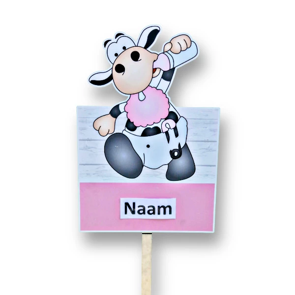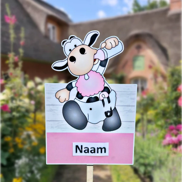 Op zoek naar hetzelfde geboortebord maar dan voor een jongetje? Bekijk dan het Geboortebord Koe met fles Blauw hier!