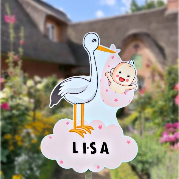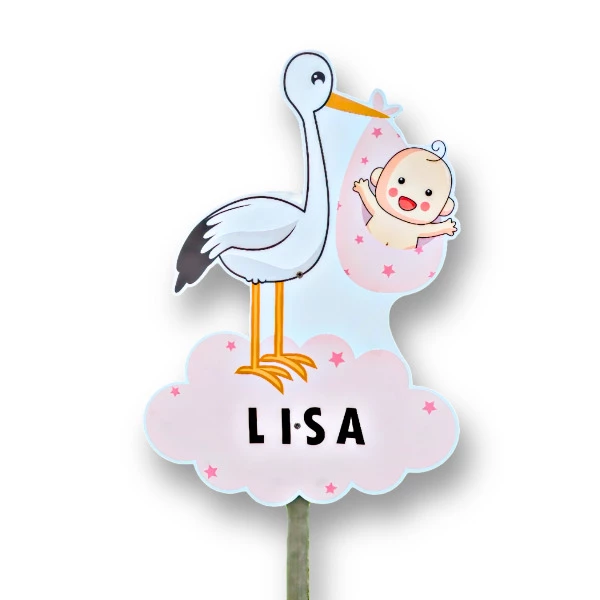 Geboortebord tuin Ooievaar wolk Roze