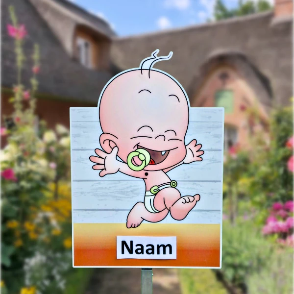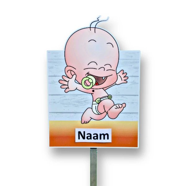 Zoefff... daar gaat de rennende baby. Met een grote glimlach laat dit geboortebord iedereen in de buurt zien dat er kleintje geboren is. Wil je de geboorte van een baby op een speelse en opvallende manier vieren? Dan is het geboortebord met de rennende baby een geweldige keuze! Dit vrolijke en energieke bord trekt gegarandeerd de aandacht van iedereen in de buurt. Met een grote glimlach laat de rennende baby zien dat er een klein wondertje is geboren. Dit unieke geboortebord is zeker iets waar je complimenten voor zult ontvangen!
