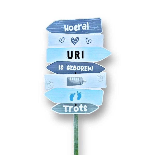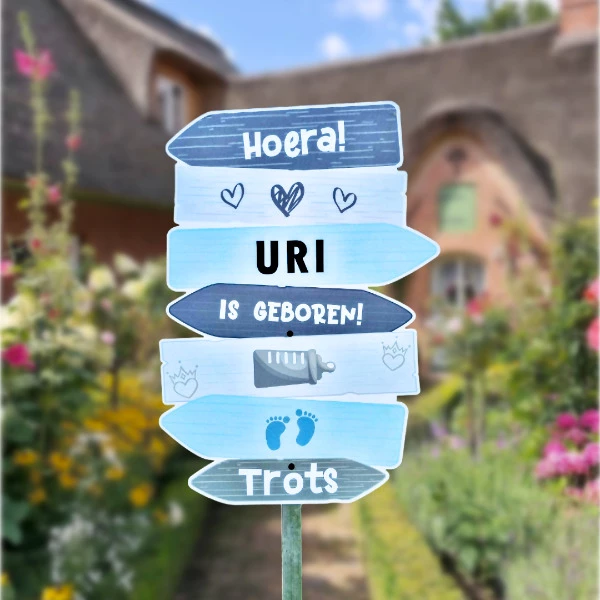 Op zoek naar een opvallend geboortebord? Het Geboortebord Wegwijzer Blauw is dé eyecatcher voor de tuin van de kersverse ouders!
